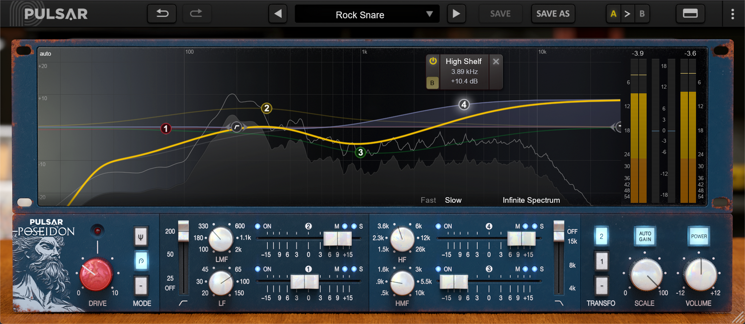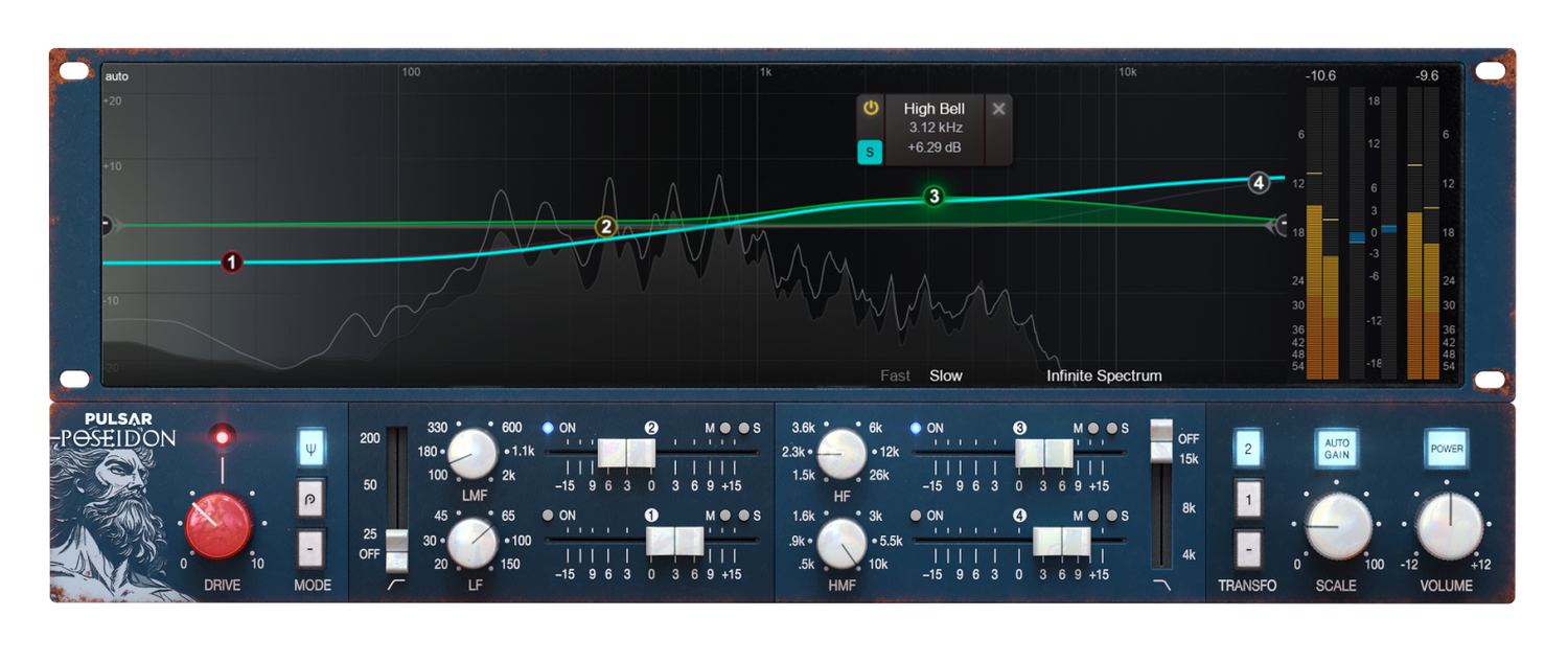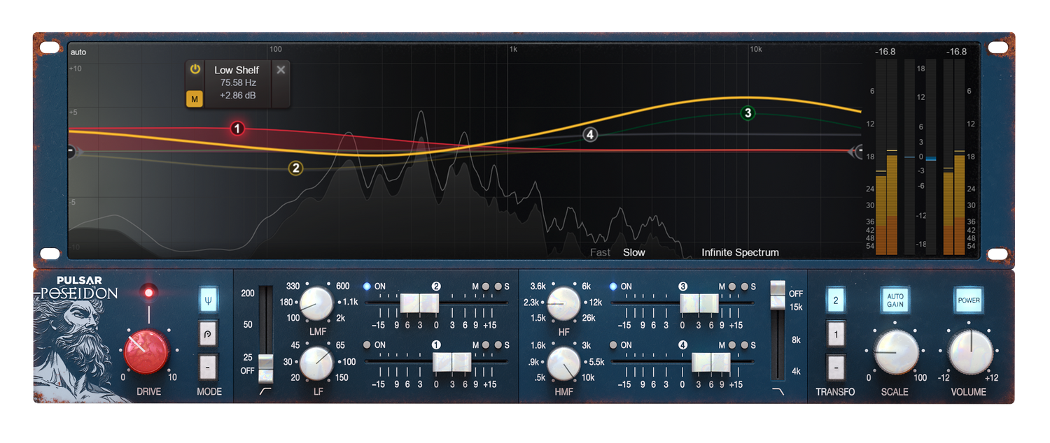 With such an idiosyncratic EQ, there’s a learning curve. The interactions between its bands are so unique that we’ve never seen a digital reproduction that makes them simple to use. So we decided to nail it ourselves with an on-screen EQ curve that reacts faithfully to the quirks of the original hardware, making Pulsar Poseidon easy to master.