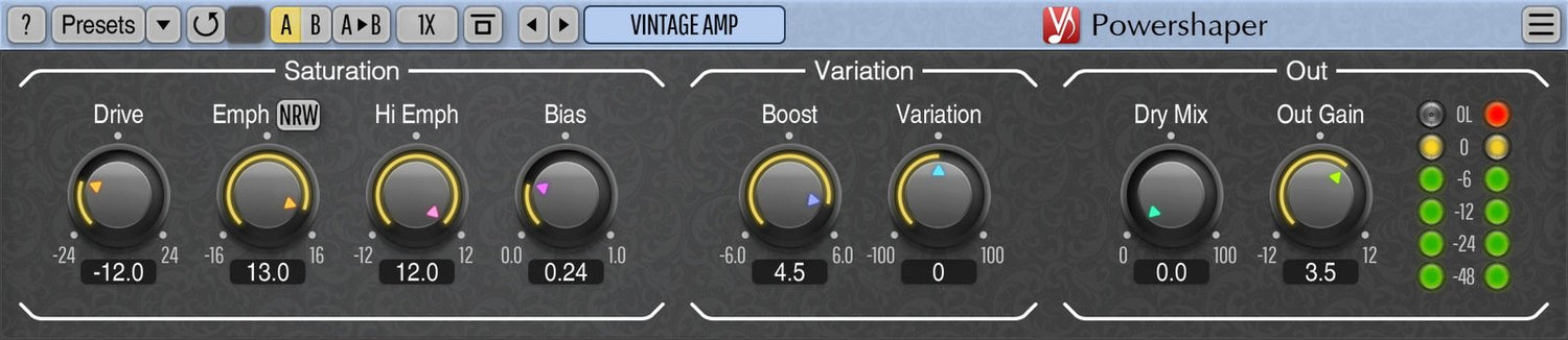 Powershaper can be used to apply saturation with good results to various sounds: vocals, drums, bass, guitars, synths, mixes.