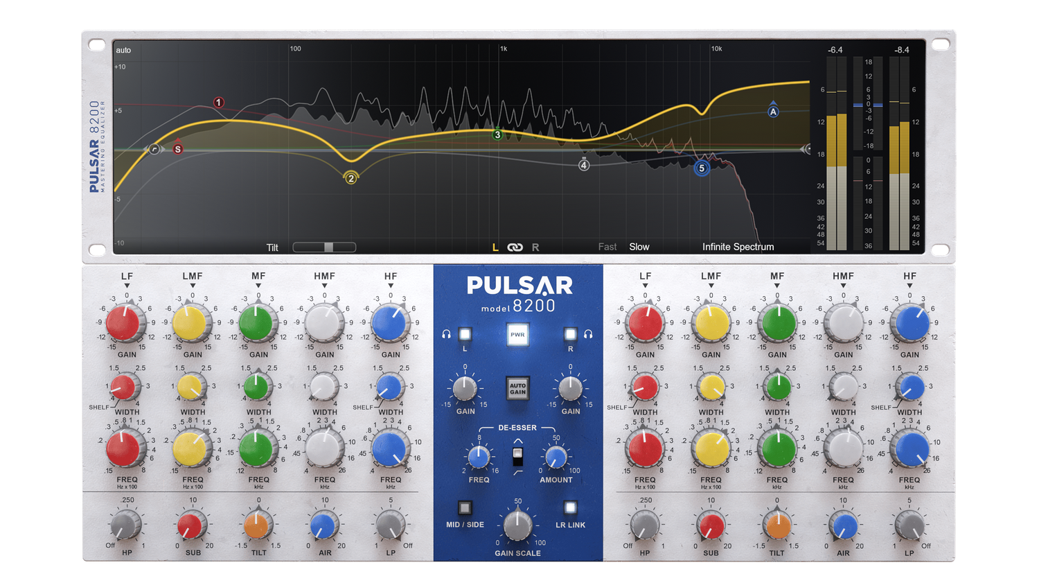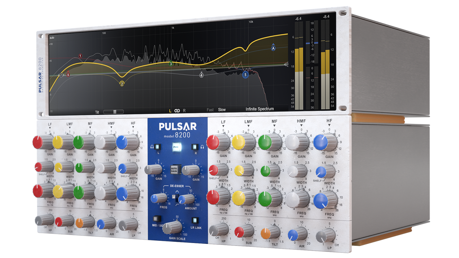 Just like the original machine, Pulsar 8200 gives you a tight and solid low end, a crystalline high end, and surgical control over the frequency spectrum. He perfectly replicates the all-discrete, Class-A analog electronics that made the original machine famous in the 80s, and still used today.