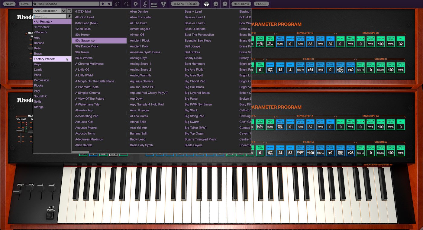 - Exactingly faithful virtual analog emulation of the analog polyphonic synthesizer released by Rhodes in 1982, from its 16 polyphonic voices to its expressive velocity and polyphonic aftertouch capabilities