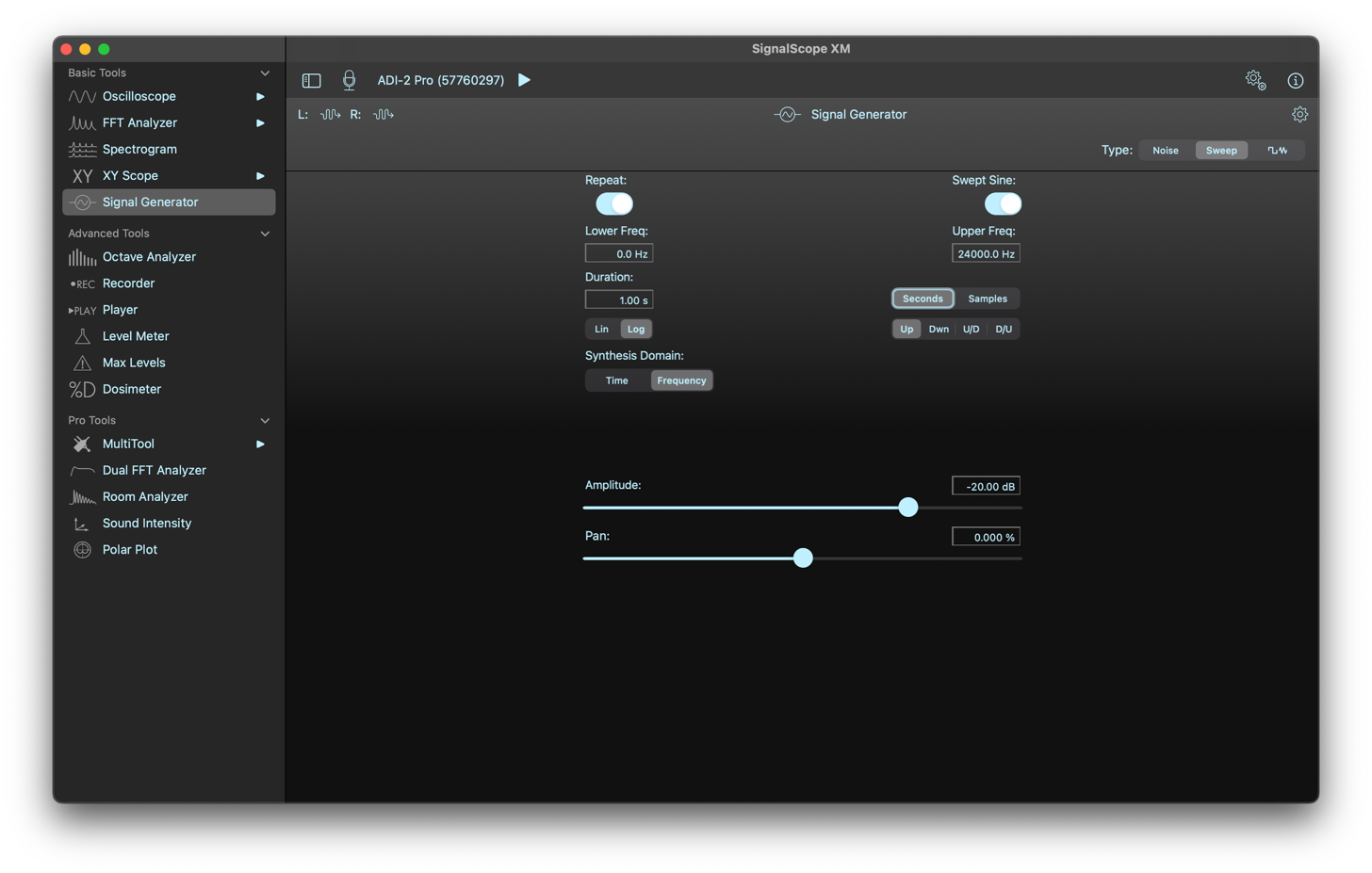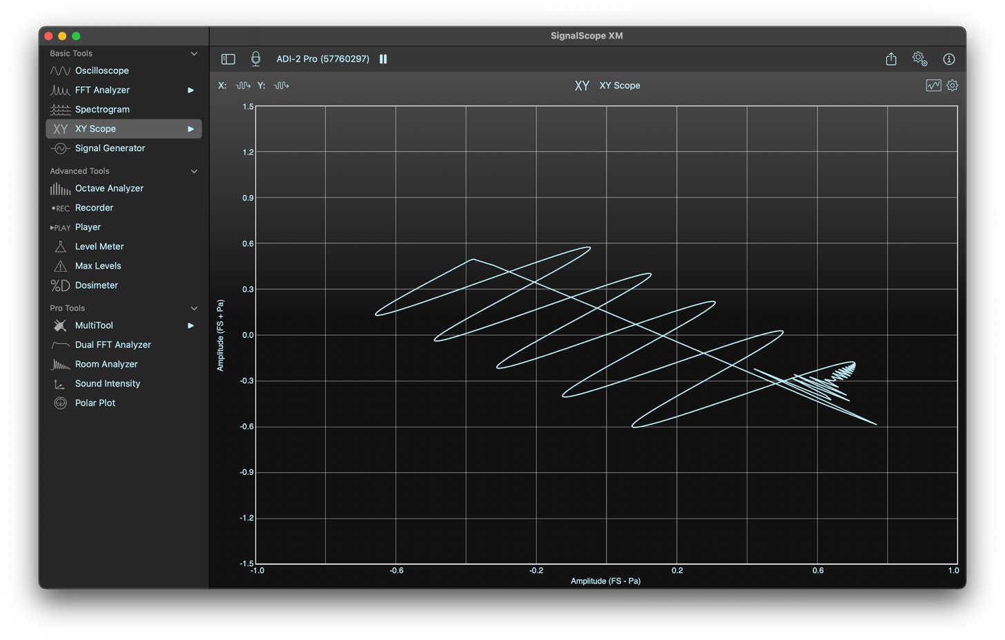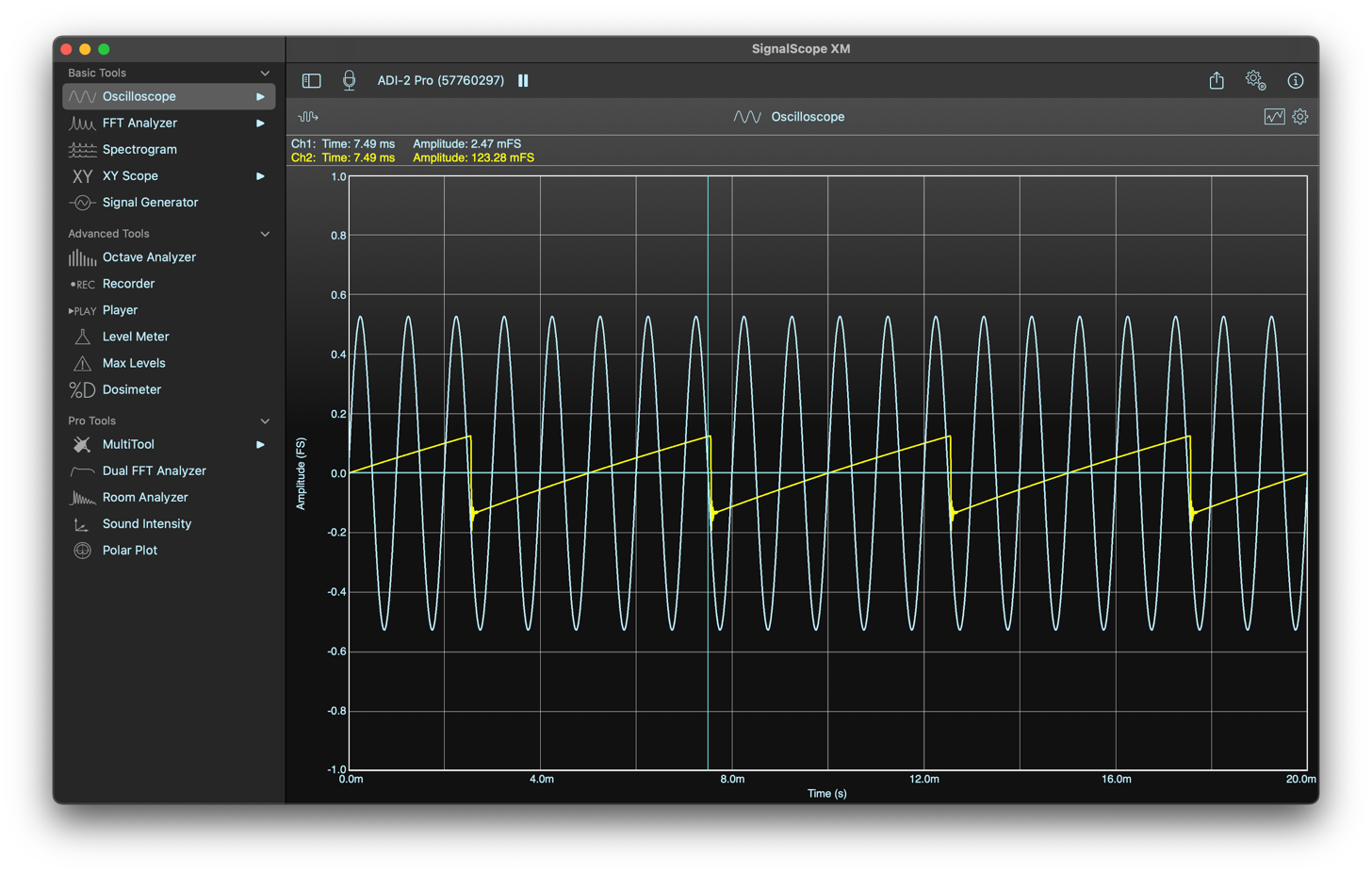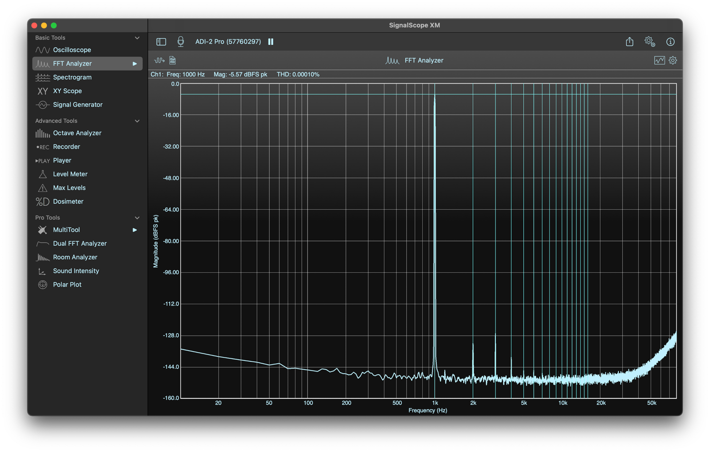 Il set di strumenti di base di SignalScope XM include l'accesso a una suite di strumenti di analisi di base, oltre a supporto hardware specializzato, come il caricamento automatico delle sensibilità dei microfoni fornite dalla fabbrica per selezionati microfoni USB, sensibilità di tensione nominale aggiornate per selezionati dispositivi di ingresso audio e calibrazione automatica per dispositivi di ingresso audio che includono informazioni sulla sensibilità integrate.