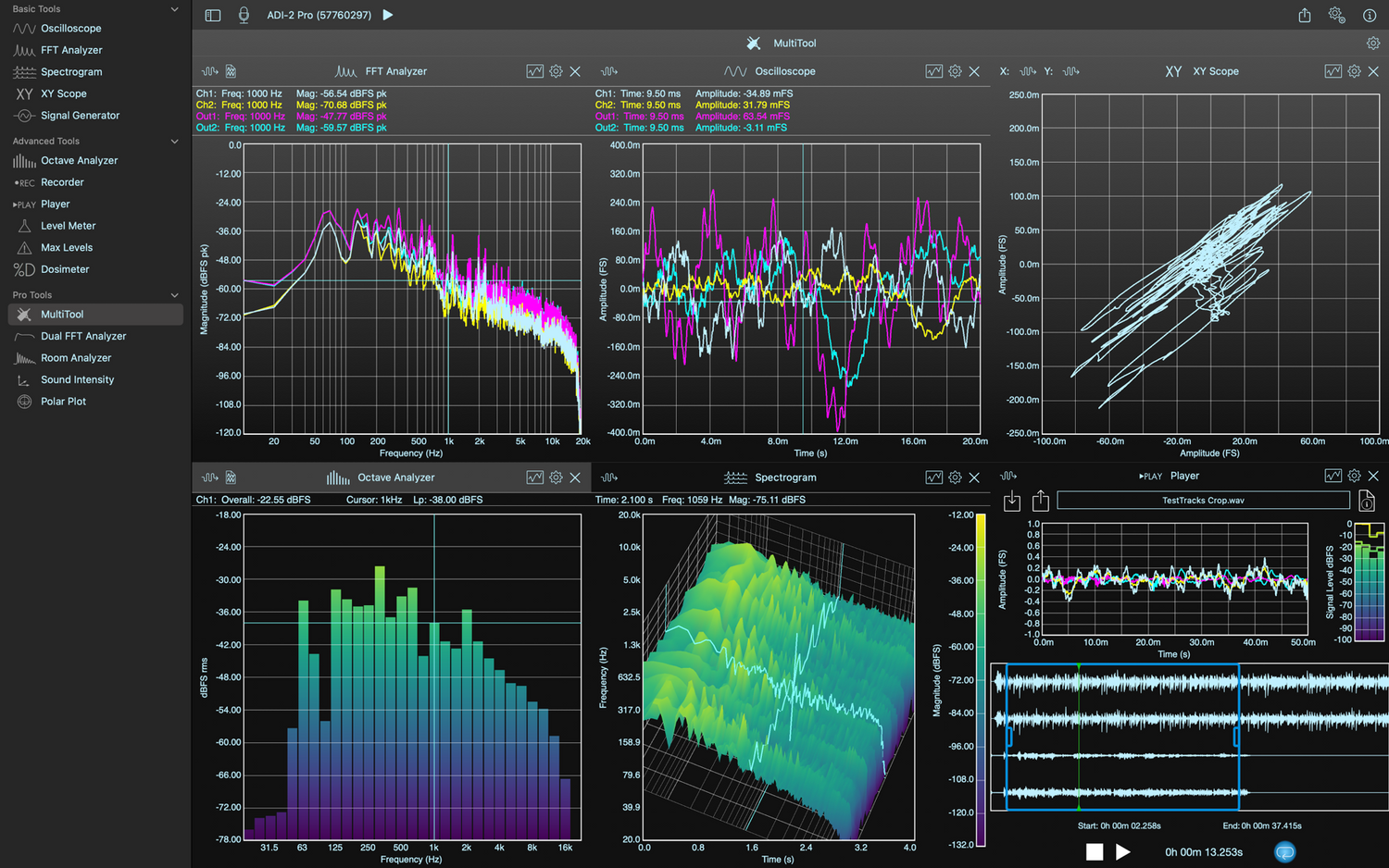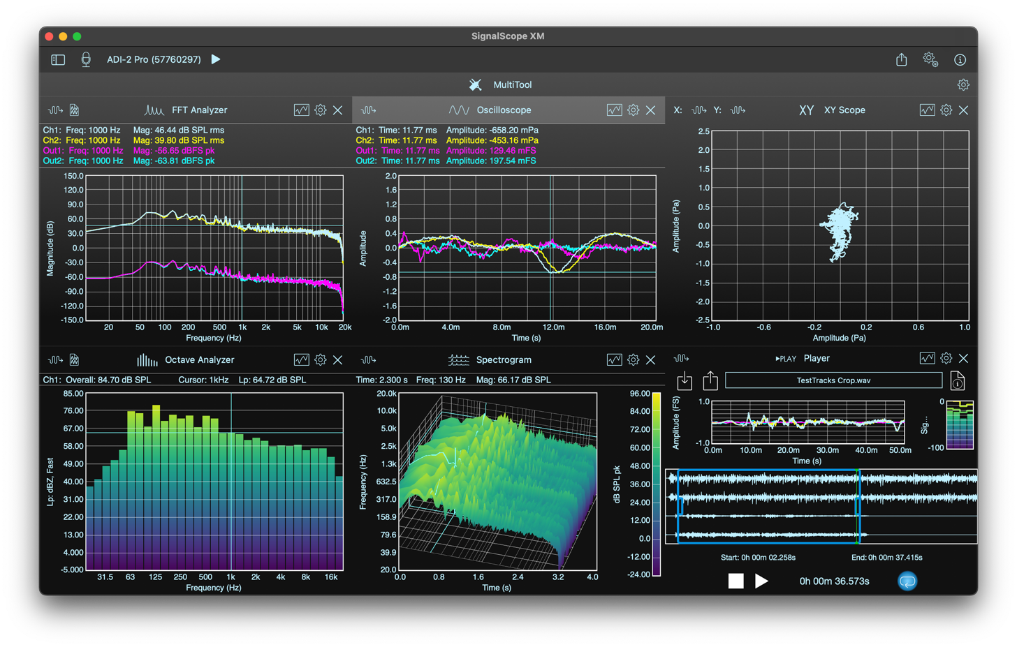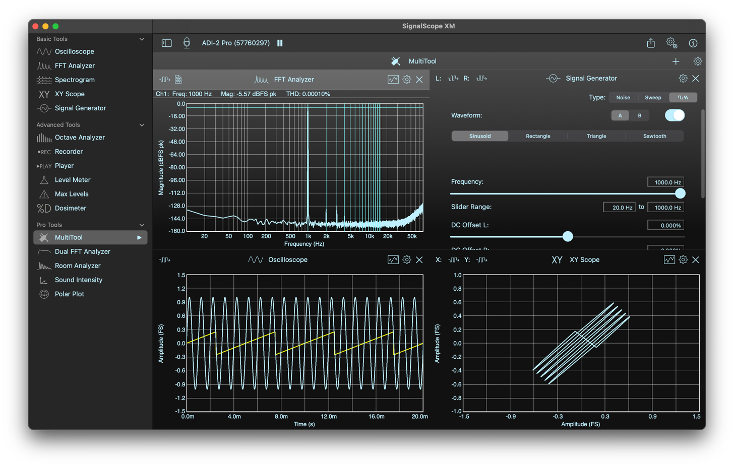 Il Pro Tool Set di SignalScope XM include l'accesso a una suite di strumenti di analisi e misurazione di base, avanzati e professionali, oltre a una suite di funzionalità progettate per utenti professionisti e supporto hardware specializzato, come il caricamento automatico delle sensibilità dei microfoni fornite dalla fabbrica per selezionati microfoni USB, sensibilità di tensione nominale aggiornate per selezionati dispositivi di ingresso audio e calibrazione automatica per dispositivi di ingresso audio che includono informazioni sulla sensibilità integrate.