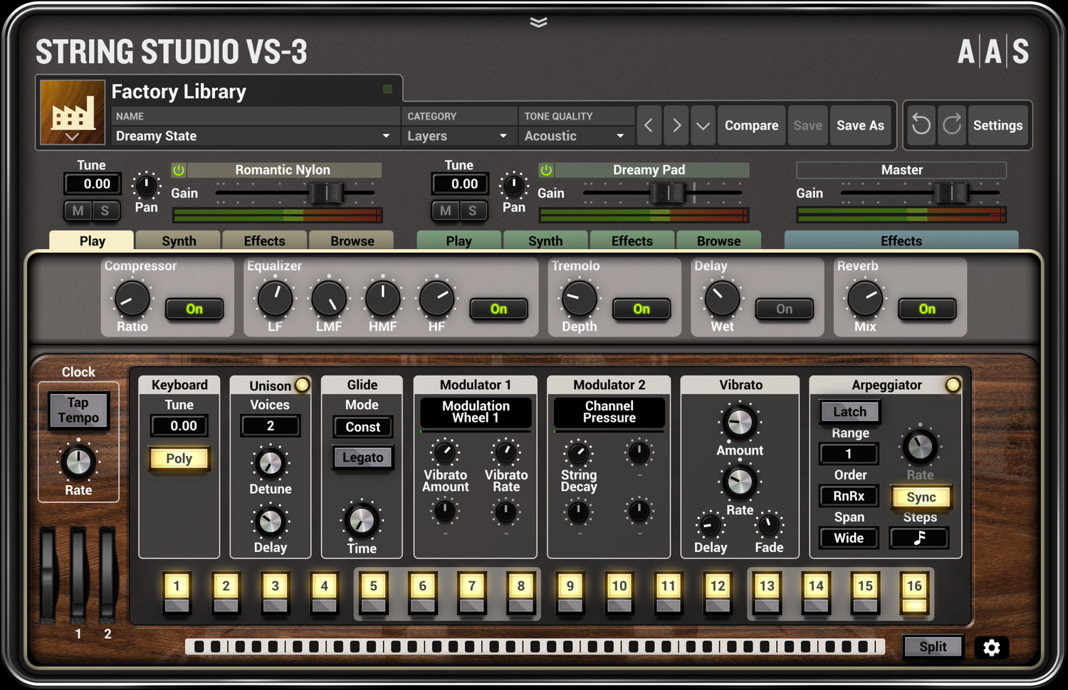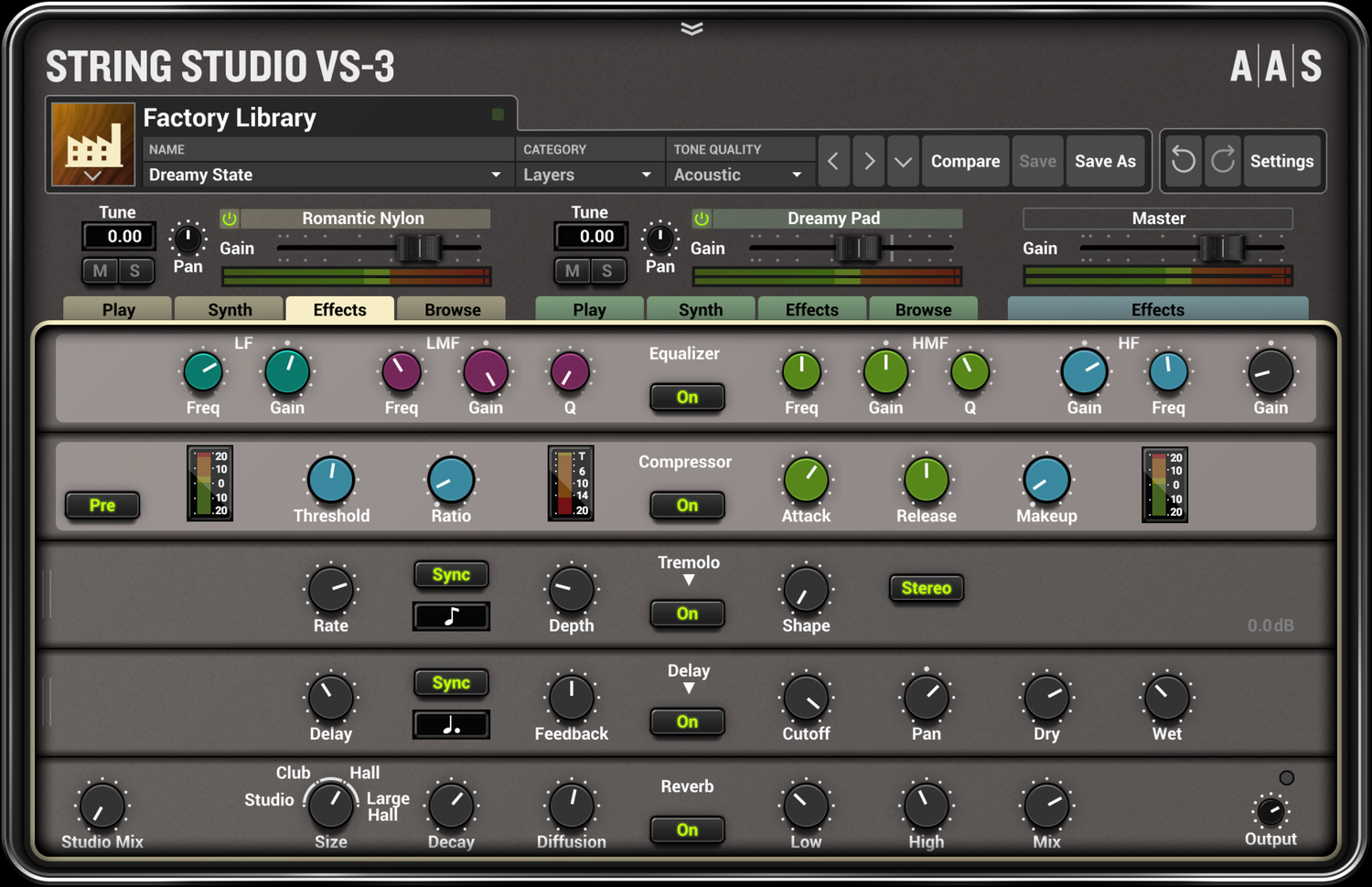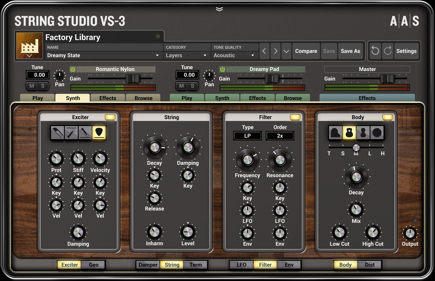 String Studio VS-3 is a string modeling synthesizer plug-in that swaps the traditional oscillator sound source for a string.