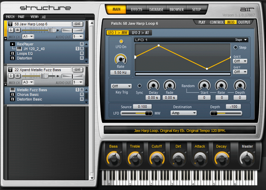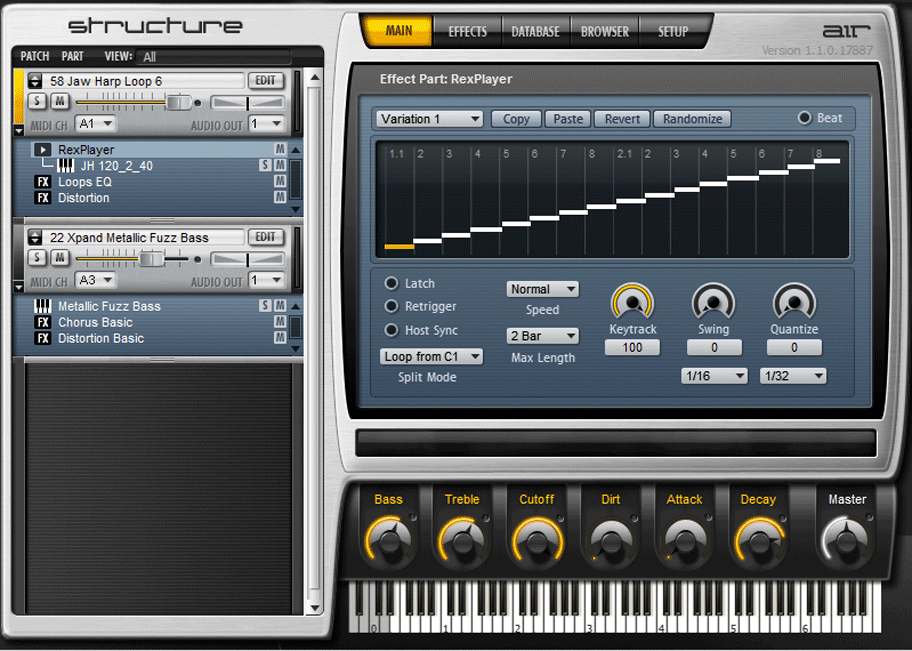 With Structure, you can create complex, rich patches by blending together multiple samples and effects. Each patch can have an unlimited number of parts, and each part can consist of a single sample, multiple samples, a sub-patch, a MIDI processor, and audio and MIDI effects. All of these elements can be rearranged and tweaked for extensive sound experimentation.