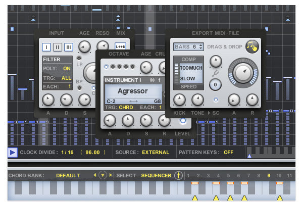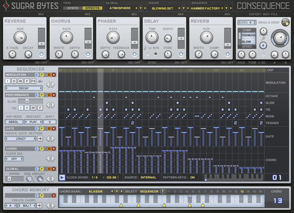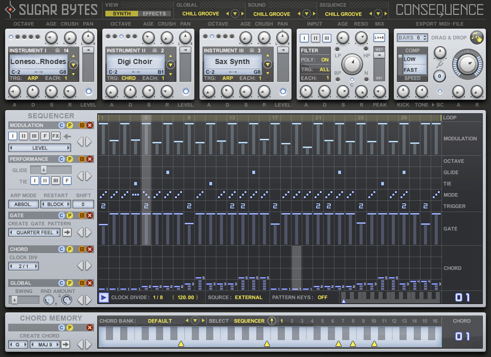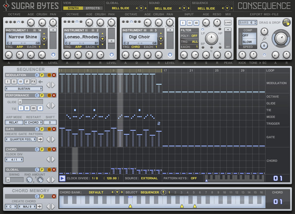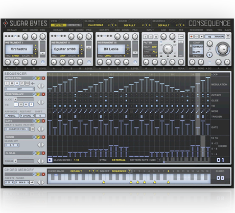 Consequence è un arpeggiatore, che crea una sequenza di note basata sugli accordi che fornisci. Fino a 3 strumenti possono essere caricati, e un vasto numero di opzioni di sequenziamento possono essere utilizzate per controllare il modo in cui il plug-in "interpreta" il tuo input.