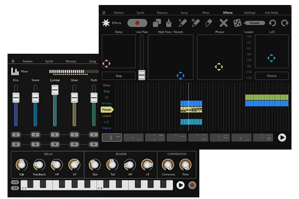 Il potente sequencer FX con otto effetti touch-controlled di prima classe è la ciliegina sulla torta di questo fantastico giocattolo musicale. Gli 8 effetti inclusi TapeStop, Filter-Delay, Reverb, Looper, Phaser, Chorus, LowPass e LoFi possono essere attivati con i controlli Touch o il FX Sequencer. I trigger e le modifiche ai parametri possono essere registrati e modificati, e le sequenze FX possono essere facilmente gestite nella pagina Memory.