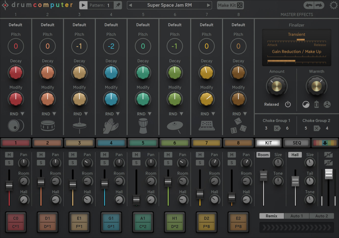 La pagina Kit fornisce le funzioni più importanti del motore sonoro. Ognuno degli otto canali del kit offre un browser di preset per il suono individuale, controlli per l'intonazione globale e il decadimento, una manopola di modifica e una funzione randomizzata profilata. Definisci un gruppo di Mute in modo da fare in modo che un trigger su un motore soffochi il suono su un altro motore e usa i Choke Groups per il soffocamento dell'hihat aperto/chiuso, ma anche per suoni sintetici interessanti.