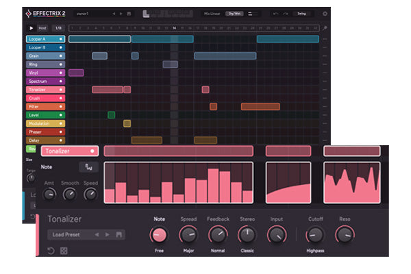 Si tratta tutta della magia degli effetti mescolati su una griglia. Dimentica ore di automazione e di scorrimento delle tue liste di plugin, basta collegare Effectrix2 e iniziare a disegnare. Usa i Loopers per loopare oltre la follia, con facile modulazione di tempo, velocità e tonalità.