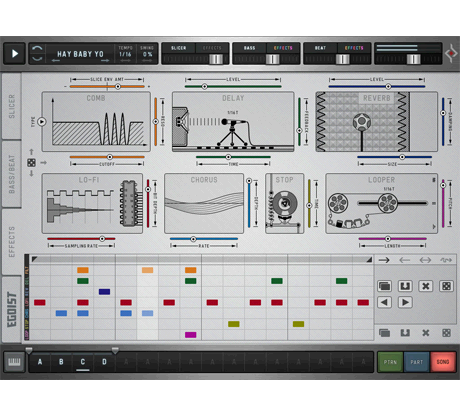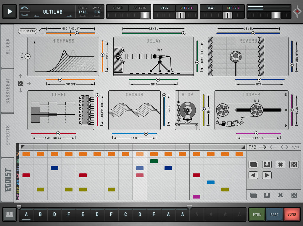 Proprio come un sequencer hardware tradizionale, Egoist utilizza un metodo basato su pattern per concatenare i pattern in una canzone. Ogni pattern può contenere un campione diverso, una configurazione di slicing, bassi, beat e configurazioni di effetti individuali…