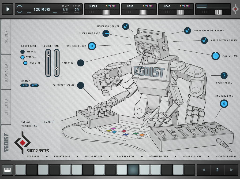 Usa campioni o canzoni complete come fonte sonora. Groove istantaneo. La linea di basso integrata, una drum machine e il sequencer multi-effetto rendono Egoist lo strumento perfetto per abbozzare tracce in studio e on the road. Ti innamorerai presto delle sue caratteristiche distintive e del suo concetto.