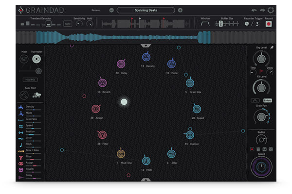Con fino a 64 grain, Graindad offre ampie possibilità per definire il tuo suono in tempo reale. Con 12 parametri principali, viene fornito un accesso rapido e potente alla sintesi granulare.