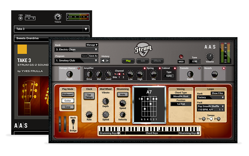 Resident sound designer Yves Frulla presents his third Strum GS-2 sound pack conveniently titled Take 3—featuring 12 styles, 73 guitar presets, and 84 strumming patterns playable with your own chord progressions. This new collection features those hard to find odd time signature grooves you have been looking for—3/4, 6/8, 9/8, and 12/8 aimed at rock, blues, pop, country, and reggae.