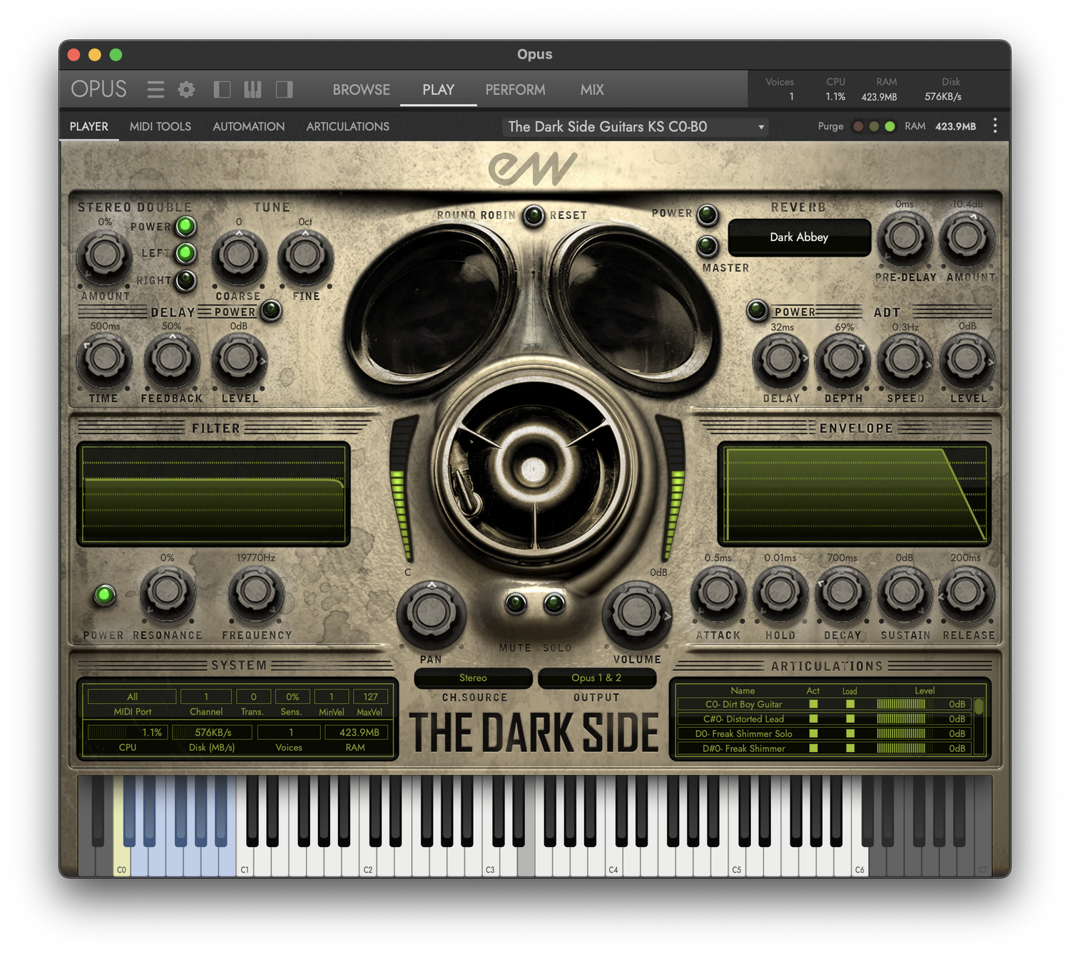 THE DARK SIDE include una vasta collezione di 40 Gigabyte, comprendente strumenti scuri e inquietanti, e batterie e percussioni altamente elaborate, bassi, chitarre, strumenti etnici, tastiere, archi e strumenti elaborati, tutti organizzati in gruppi strumentali in modo da poter creare tracce complete.