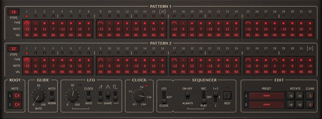 Il sequencer nell'hardware originale potrebbe essere stato un colpo di genio. La versione di Repro-1 ti consente di registrare a passi due pattern di fino a 32 note ciascuno, che vengono anche salvati con il preset e supportano il copia/incolla dei preset dei pattern tra diverse istanze del plug-in.