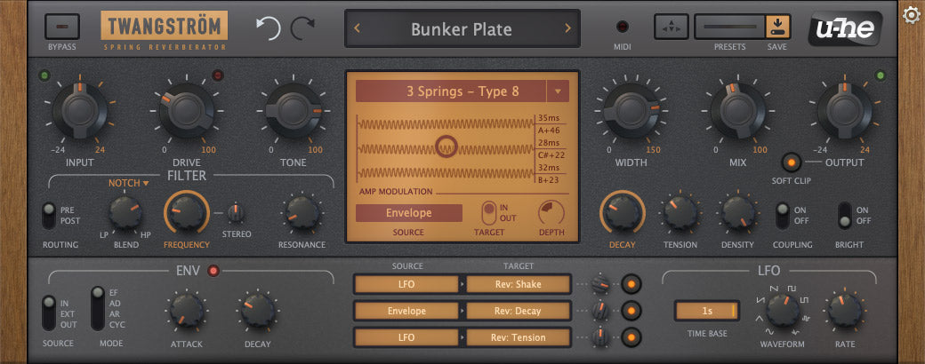 Una flessibile scatola di riverbero a molla. Se sei familiare con Bazille, potresti già aver incontrato la sua unità a molla integrata. Abbiamo preso quella, poi modellato altre due unità di riverbero, abbinandola a una sezione di drive, uno stadio di filtro, un'inviluppo e una matrice di modulazione. Emula una selezione accuratamente scelta delle unità più popolari che troverai negli amplificatori per chitarra e strumenti, ricreando il carattere particolare delle vere molle.