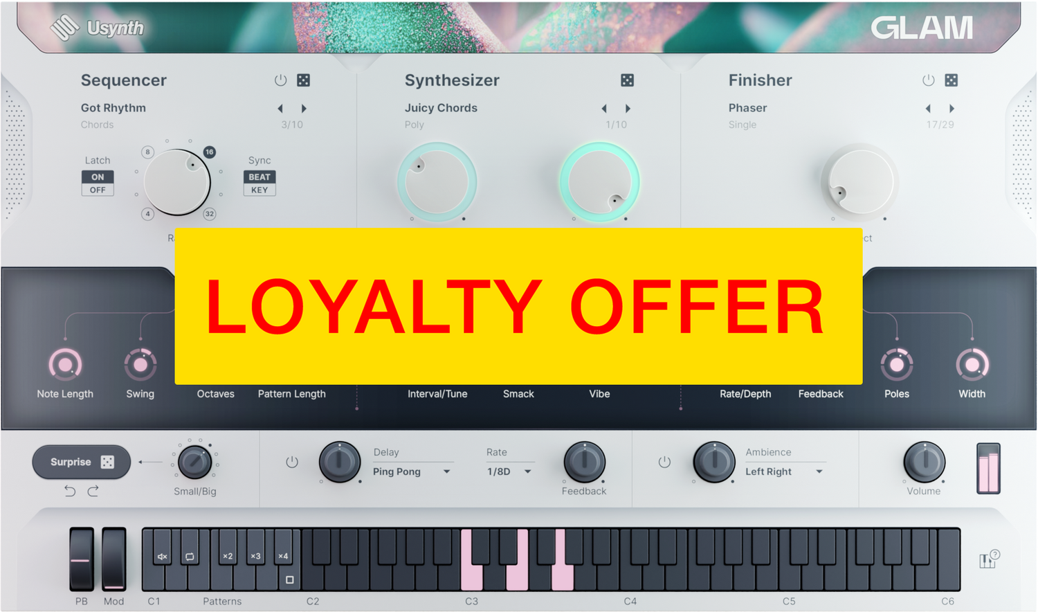 Crea musica pop che va dritta ai centri del piacere con Usynth GLAM. Ha i bassi, i pad, i polys e i leads e tutti i ganci di cui avrai bisogno. Pensa a GLAM come al fratello di 2080 e CORE che vive a Beverly Hills.