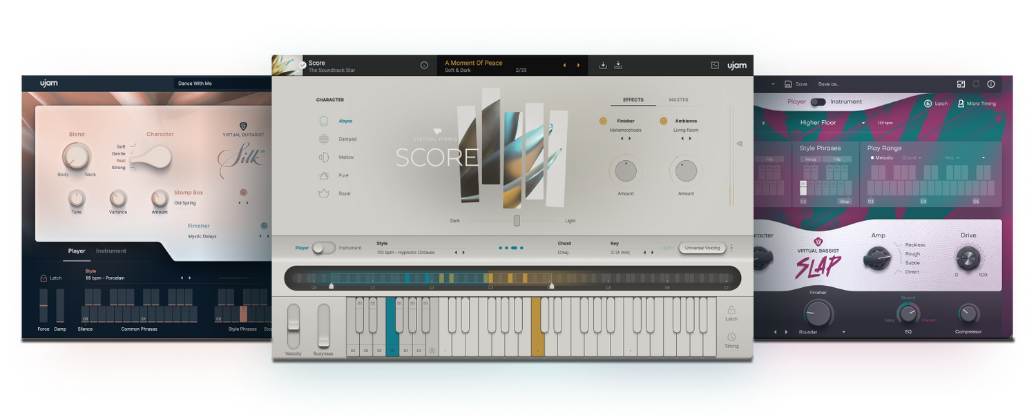 Virtual Pianist SCORE offre performance di pianoforte cinematografiche, mentre Virtual Guitarist SILK 2 suona parti di chitarra acustica dal suono professionale. Aggiungi energia con gli stili funk dinamici di Virtual Bassist SLAP.
