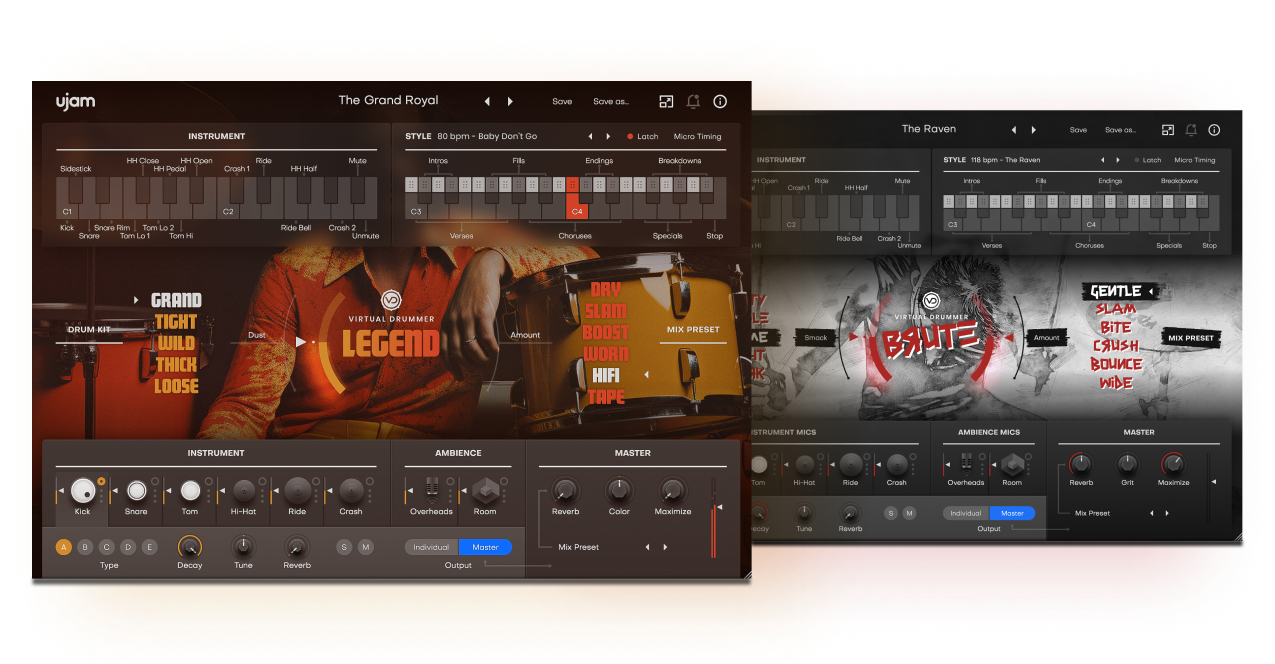 Scatena l'eccitazione con i suoni rock classici di Virtual Drummer LEGEND o produci ritmi pesanti con Virtual Drummer BRUTE. Entrambi offrono groove autentici di qualità da studio in pochi secondi.
