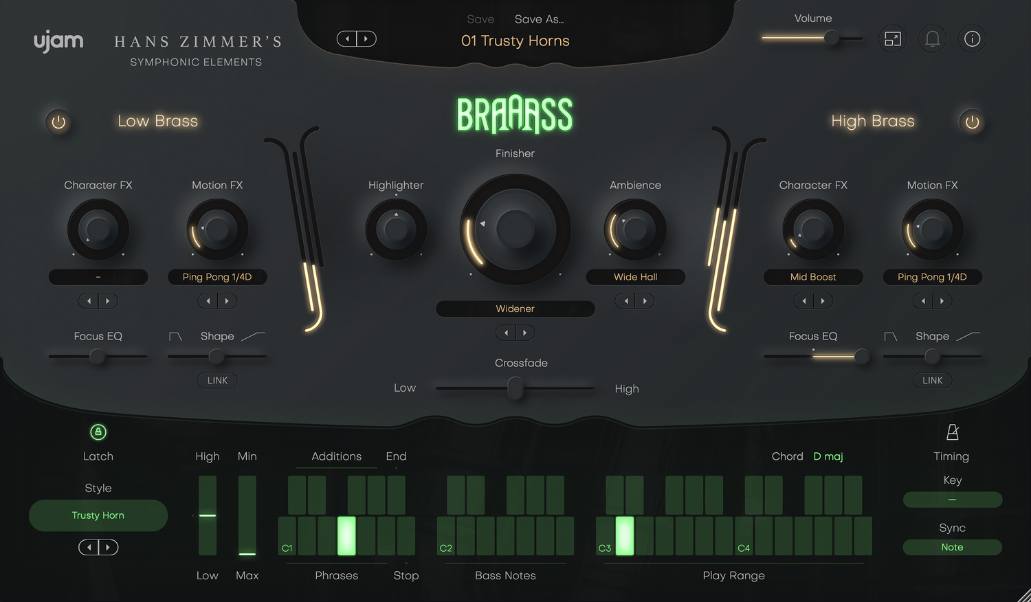 Sfrutta il potere maestoso degli ottoni con corni francesi, trombe, tromboni e altro, tutti registrati negli iconici Remote Control Studios di Hans Zimmer. Con 78 stili ritmici, oltre 450 frasi pre-arrangiate e più di 250 preset per sound designer, BRAAASS offre fanfare cinematografiche, accenti audaci e texture di ottoni atmosferiche. Che tu stia creando crescendo drammatici o colpi ritmici, questo strumento fornisce la performance di ottoni perfetta, ogni volta.