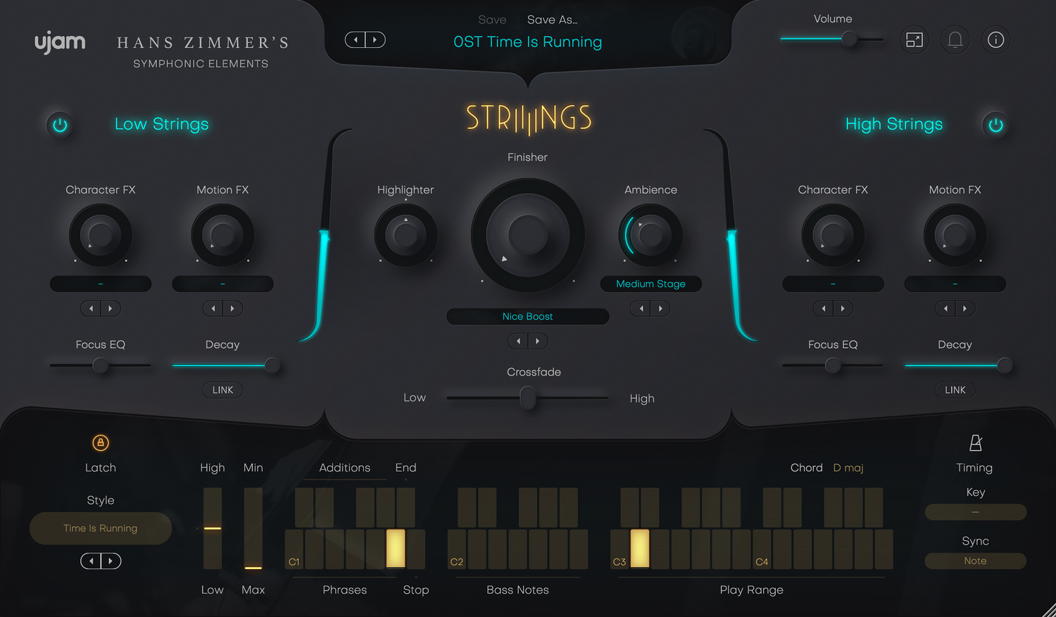 Cattura il potere evocativo ed emotivo di viole, violoncelli, violini e contrabbassi, tutti registrati negli studi di fama mondiale di Zimmer. STRIIIINGS include 60 stili e oltre 200 preset per sound designer, offrendo tutto, da ricchi crescendo di archi a motivi ritmici. Le sezioni dedicate ai Bassi e agli Alti Archi ti permettono di scolpire il tuo suono con il massimo controllo, mentre gli strumenti integrati Finisher e Ambience FX offrono capacità di sound design trasformative per creare texture drammatiche e profondità cinematografica.
