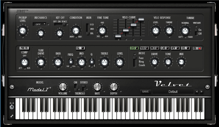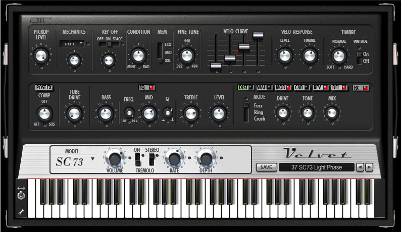 Based on the Fender Rhodes Suitcase, Fender Rhodes MK I and MK II Stage Pianos, Wurlitzer 200A and Hohner Pianet-T, Velvet accurately emulates the sound quality, response, and nuances of each original instrument to bring your piano tracks to life. Additionally, Velvet features a pallet of onboard effects and allows you to control every aspect of the sound for unparalleled realism: turn up the tube drive controls in the preamp section to warm up your tone; adjust the timbre, dynamic response, and velocity curve to customize the playing feel; and mix in the sound of pedal and other keyboard mechanical noises to recreate an authentic electric piano track.