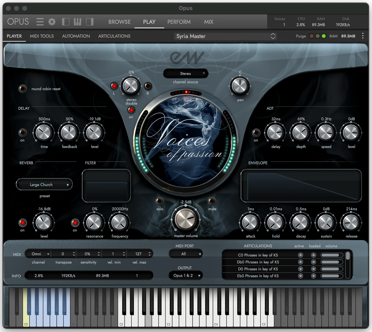 VOICES OF PASSION è il primo strumento virtuale a presentare intervalli legato veri (solo americano e gallese). Le frasi mediorientali e indiane sono presentate in un formato di kit di costruzione che consente agli utenti di creare performance molto lunghe e coerenti. I controlli della mod-wheel influenzano il punto di ingresso sulle frasi etniche.