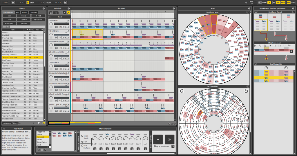 Liquid Rhythm utilizza un linguaggio musicale basato su pattern intuitivo per trasformare il tuo flusso di lavoro e permetterti di visualizzare i ritmi in un modo completamente nuovo. Usa la struttura Music Molecule codificata a colori per aiutarti a navigare efficacemente nello spazio delle possibilità ritmiche o per mirare selettivamente ad aspetti del tuo ritmo da variare o complessificare.